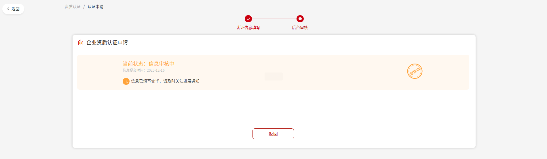 在【資質認證】查看企業資質審核狀態,狀態為“審核通過”時,您可查看您的企業信息,如下圖: