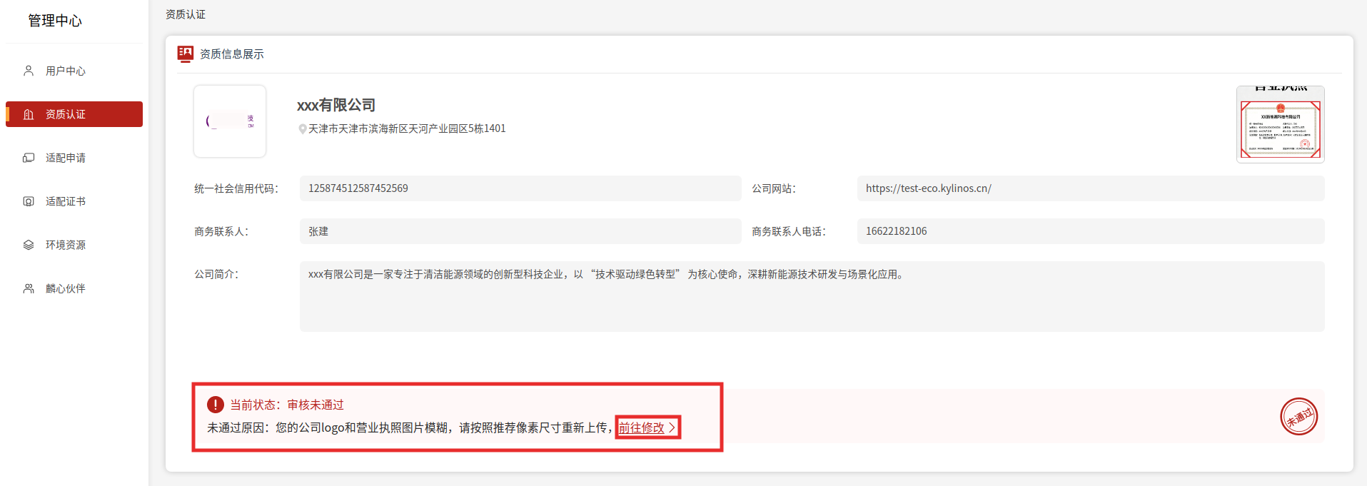 在【資質認證】查看企業資質審核狀態,狀態為“審核未通過”時,您可查看未通過原因,點擊“前往修改”按鈕,修改企業信息再次提交,如下圖