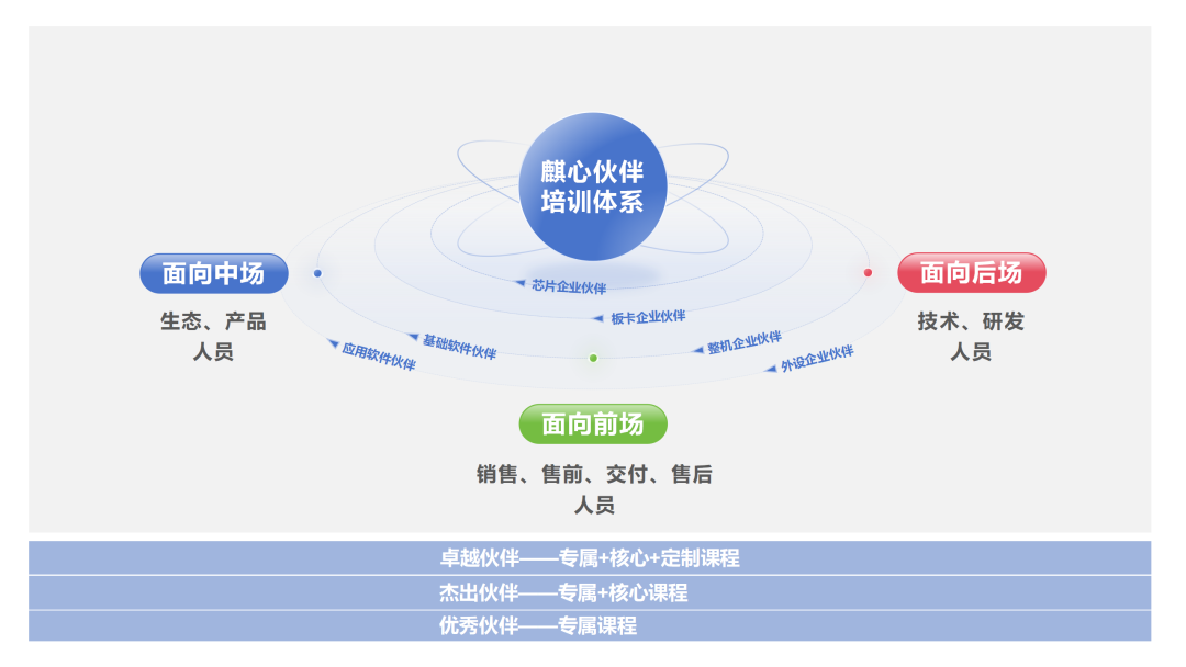 為幫助麒心伙伴緊跟網信市場發展態勢、提升各方人員能力、增強綜合競爭力,麒麟軟件為麒心伙伴制定了專屬賦能培訓體系。這其中有面向前場銷售和售前人員開展的麒麟軟件主流在售產品相關課程,和面向后場技術服務、售后、項目交付人員開展的麒麟軟件桌面和服務器操作系統相關產品的安裝、交付、運維、常見故障排查相關課程,以及面向中場生態適配相關人員的適配工具、技術等相關方面的課程。