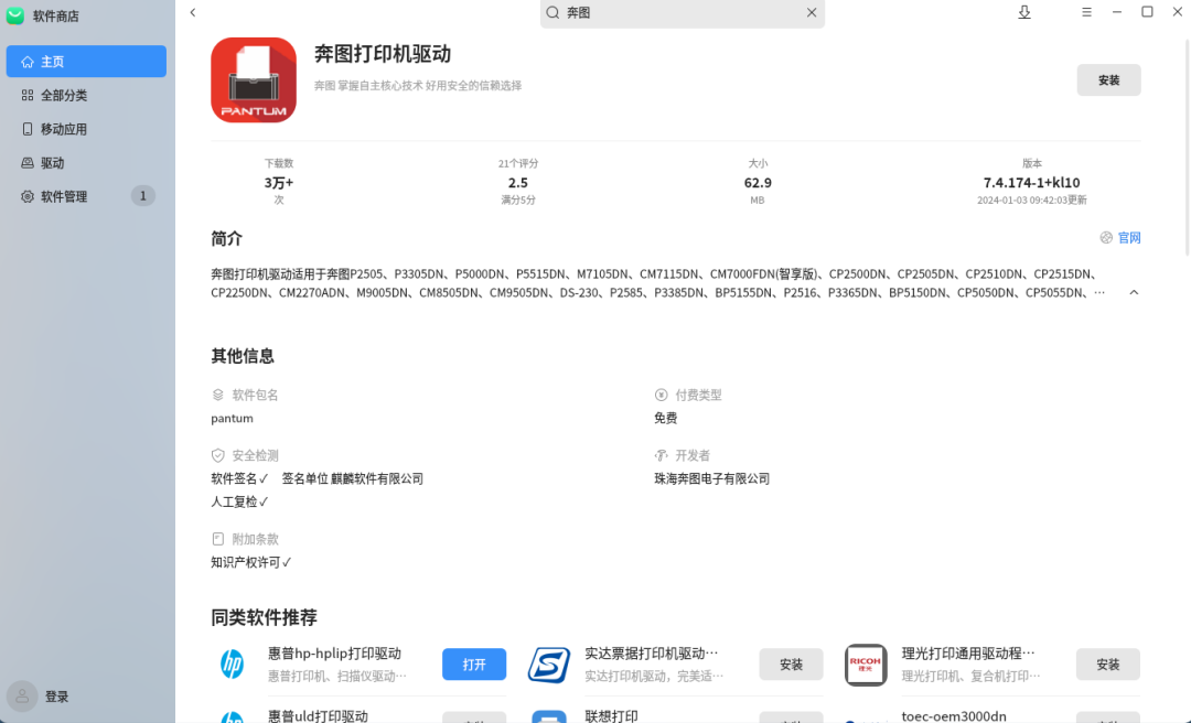 通用軟件提質看得見|一鍵安裝、自動添加,“奔圖打印機驅動”上架麒麟軟件商店