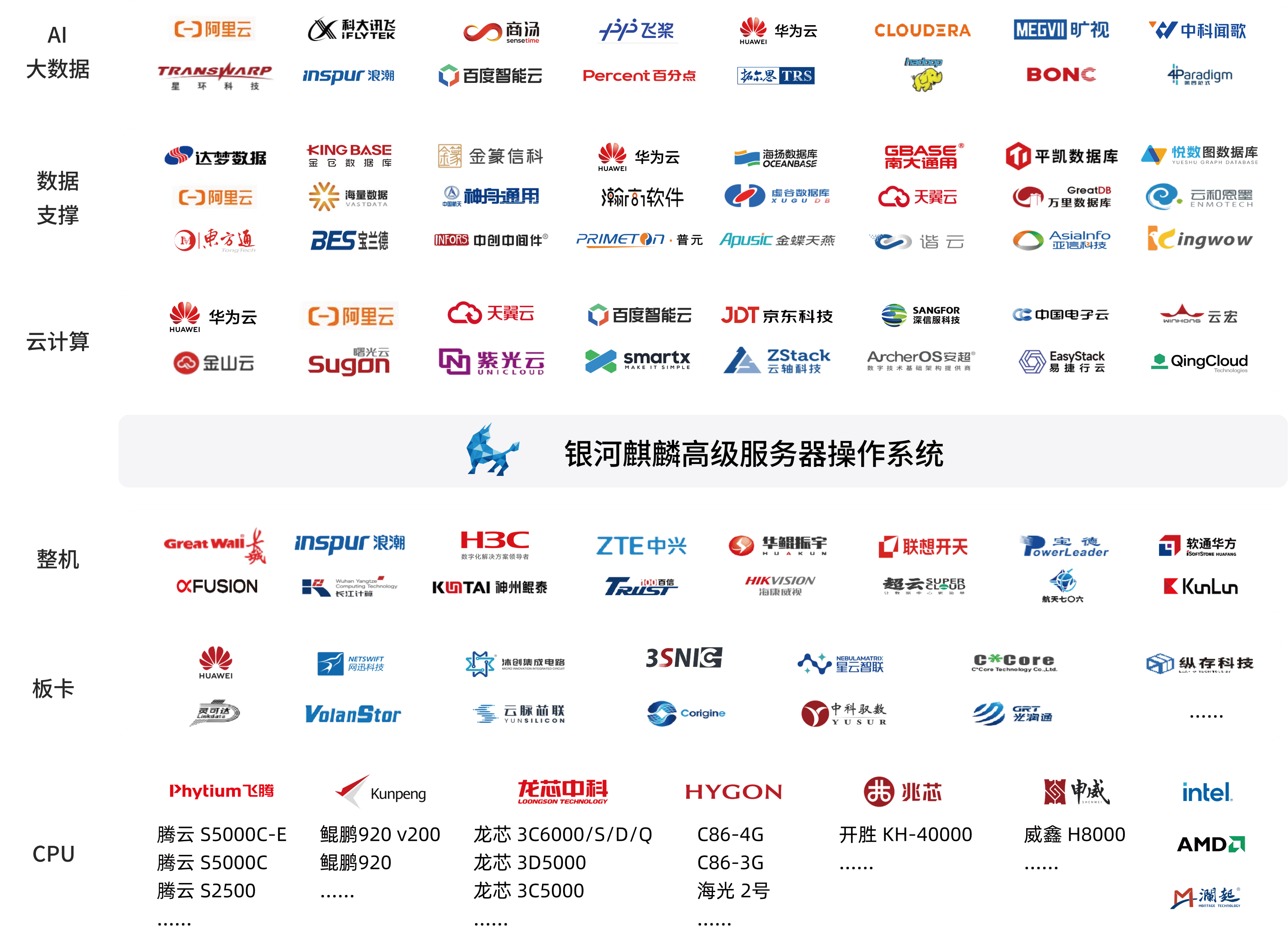 銀河麒麟高級服務器操作系統 V11 兼容主流國內外整機、板卡、外設;支撐國內外主流數據庫、中間件、服務端等組件、商業軟件及開源軟件。 面向云化及智能化發展趨勢,系統持續加強對算子庫、框架模型、關鍵組件及主流硬件設備的深度融合適配,與眾多伙伴統一合作,共享資源、合鑄價值、協同共贏,促進生態建設自主與高質量發展。
