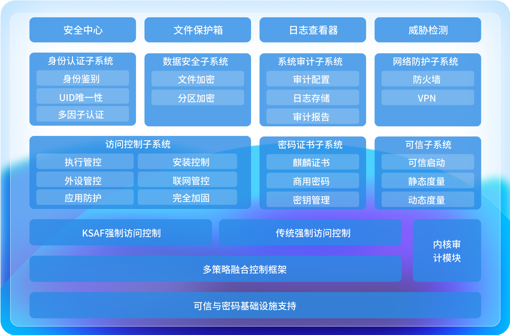 以全新 KSAF 安全框架為核心、全面支持國家商用密碼標準,融合身份認證強化等多種手段,構建分層解耦、靈活擴展的高安全防御體系,有效保障系統的安全性。