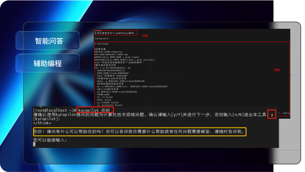 基于大模型與 RAG 技術,實現自然語言問答(覆蓋運維、系統管理、Linux 基礎知識)與輔助編程(代碼生成、解析、測試用例生成),并可通過自然語言觸發調優工具,完成系統優化。