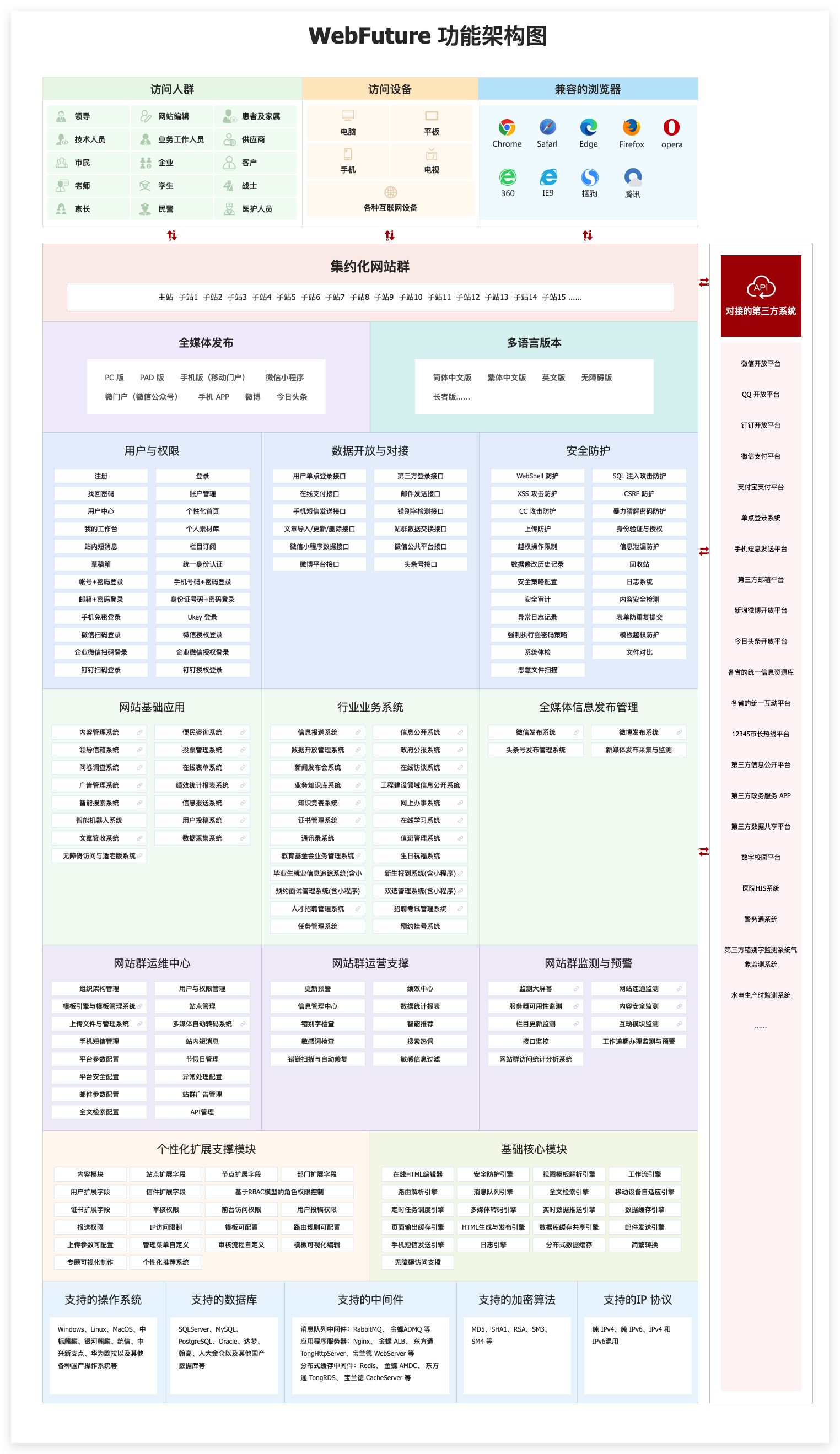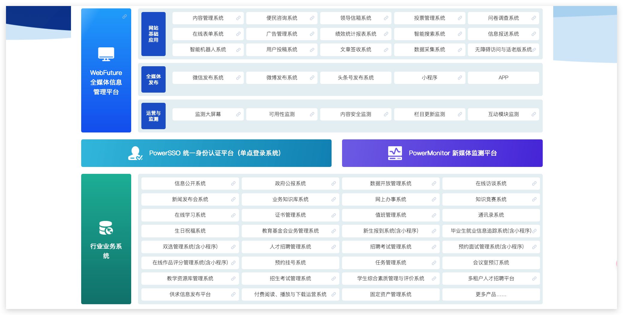 為滿足各行業網站集約化建設、自主創新、移動適配、全媒體發布和監測、無障礙改造和適老化建設等產業趨勢發展的需求,方案基于銀河麒麟操作系統與動易 WebFuture 全媒體信息管理平臺深度開發為各行業量身定制的整套解決方案,幫助不同行業客戶的信息化主管部門將各職能部門的所有網站、業務系統及服務納入集群平臺,實現統一管理、信息同步、資源共享和全媒體發布,提升門戶網站的整體運營效率和服務水平。