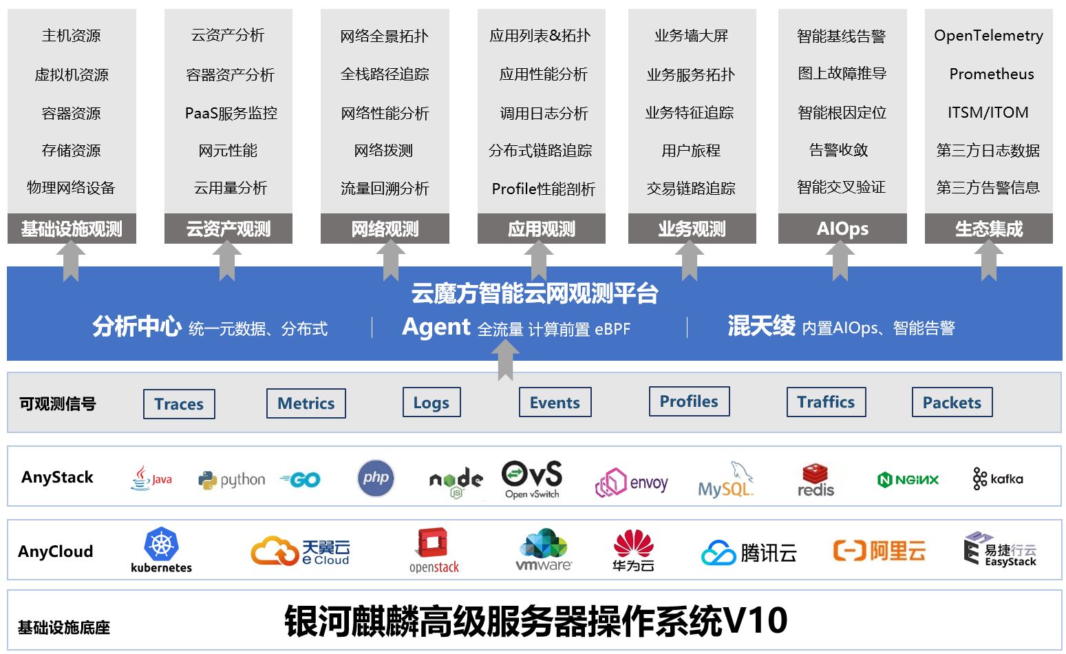 本方案主要應用于基于銀河麒麟高級服務器操作系統V10搭建的云及云原生業務運行環境,根據云網業務運行架構特點開發的一款全棧可觀測性平臺,為用戶提供基于業務、應用、網絡、基礎設施等多維度的可觀測性能力,提升云網運維能力。