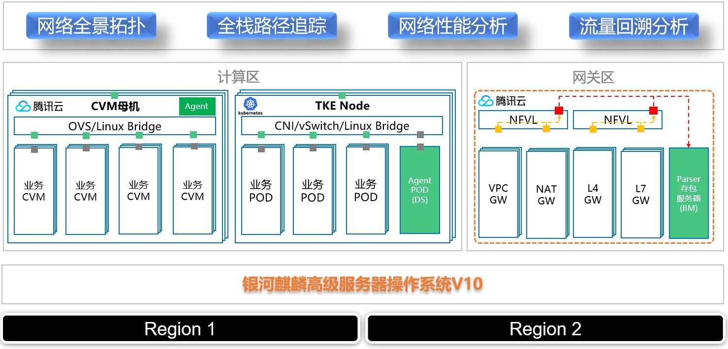建設內容:騰訊全棧云架構下,基于銀河麒麟高級服務器操作系統V10,構建業務流量全景自動拓撲、端到端全鏈路追蹤與全天候流量回溯取證的保障能力。