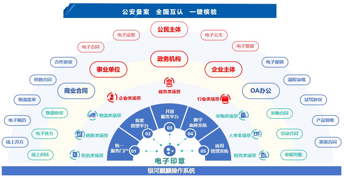本方案依托銀河麒麟操作系統為基礎運行支撐,搭建電子印章制作與管理服務平臺,實現電子印章公安備案,廣泛應用于電子公文、電子證照、電子票據、電子合同等場景,適配OA、CRM、ERP等管理系統及HIS、EMR、LIS等專業系統,憑借其安全穩定的運行環境,為各類數字化場景提供可靠技術支撐,助力業務高效開展。