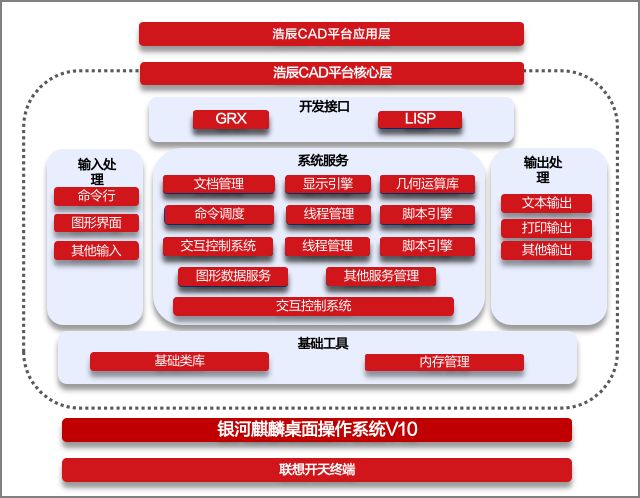 解決方案基于銀河麒麟桌面操作系統V10之上,運行浩辰CAD設計軟件,完美兼容R14-2018的各個版本DWG/DXF及字體、線型和填充等相關數據文件。滿足用戶CAD圖紙繪制、編輯、標注、輸出等設計需求。方案延續用戶熟悉的界面風格和操作習慣,讓設計師零成本上手,快速實現國產化平臺高效設計的目標。同時,通過聯想開天終端兼容性和穩定性驗證測試,并基于銀河麒麟桌面操作系統平臺進行深度優化,為業界用戶提供最佳實踐。