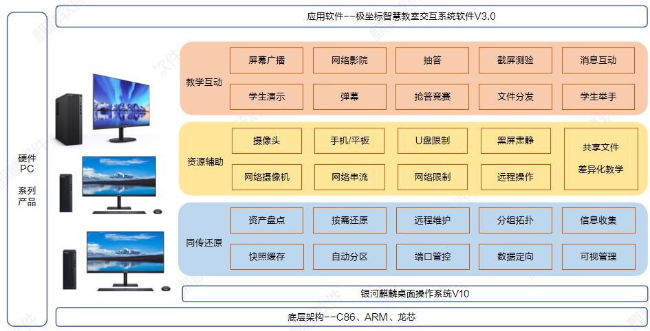 • 特有的功能設置,如共享文件、手機投屏、截屏測驗等,讓傳統的機房教學升級為智慧教學空間,為用戶提供豐富的教學方式選擇,真正做到跨芯片架構、跨系統統一管理,同步教學。