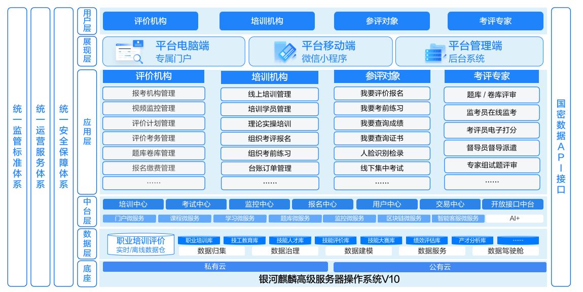 本方案主要應用于在自主創新操作系統全面更替的背景下,為符合國產化采購與信息技術安全創新人才認證標準,使用銀河麒麟操作系統助力于教育培訓行業的技術技能培訓業務系統,涵蓋“教、學、測、練、考、評、證、就、賽、創、管、服”全流程核心場景,實現教育培訓個性化、數字化、智能化服務需求。