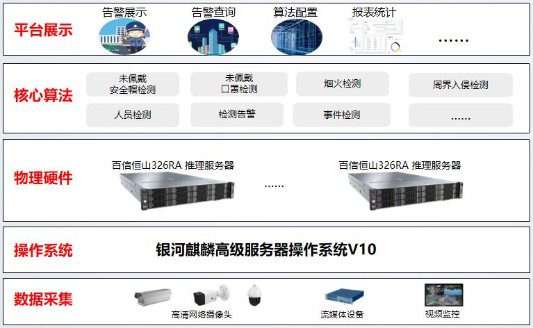 本方案是依托銀河麒麟高級服務器操作系統V10提供高效靈活、安全穩定的基礎運行平臺,通過昇騰AI及計算機視覺技術構建園區全域感知應急預警平臺。為工業園區提供周界入侵檢測、未佩戴安全帽檢測、未佩戴口罩檢測、軌跡跟蹤、事件分析等創新應用,打造全棧自主創新、軟硬一體方式的產品,實現園區的安全防護,并且該方案部署簡易、節省硬件資源。