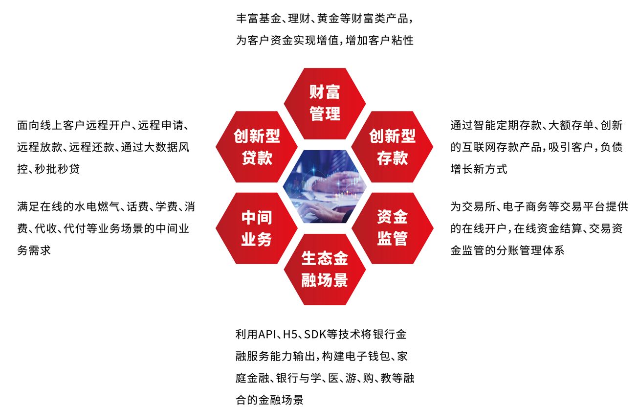 互聯網金融核心提供完整的存款、貸款、內部賬戶、虛擬賬戶、產品工廠、會計核算等核心業務管理體系。提供二三類賬戶管理,存款產品及業務管理。提供自營貸款,聯合貸,助貸等業務的貸款賬戶及核算管理。提供支持電子錢包、支付錢包、親情賬戶、家庭金融等多樣化業務;提供支持學、醫、游、購、教等融合的金融場景。