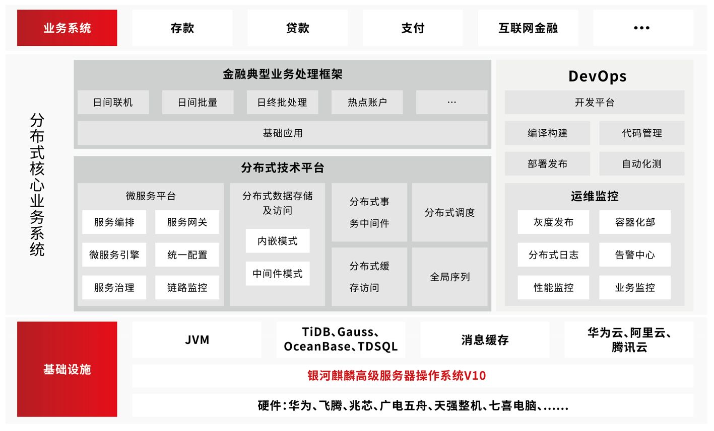 分布式銀行核心解決方案以銀河麒麟高級服務器操作系統V10為基礎,形成自主研發的Galaxy分布式技術平臺,基于分布式與微服務架構規范,采用獨立于中間件、數據庫平臺的開放式架構設計。在金融行業推進自主可信、銀行加速發展互聯網業務、加速向分布式架構轉型的趨勢下,基于銀河麒麟高級服務器操作系統V10的分布式銀行核心業務系統,在全類型金融機構的核心業務中實現應用。
