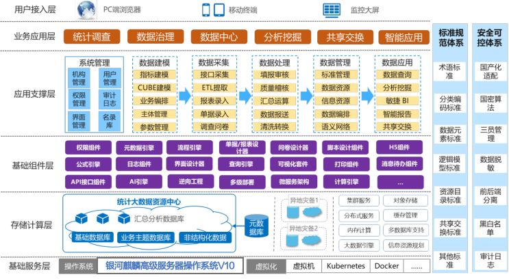 長期以來,統計和報表是各政府部門業務管理的重要手段,活躍在政務業務的各個領域。統計業務對內涉及政府內部各個業務部門,對外又與行政事業單位、企業、社會團體等各類社會主體緊密聯系,是政務管理中重要的數據生產系統。為了適應政府數字化轉型的需要,需要革故鼎新,用新的思路,新的視角,新的技術研發具備數智化服務能力的新型平臺,構建組織的數字大腦。久其聯合麒麟軟件,在全面國產化的基礎環境下,以《“十四五”國家信息化規劃》為指導方針,推進現代信息技術與統計工作深度融合,創新統計信息化服務方式,逐步建立以信息化為核心的統計數據生產系統,賦能統計工作創新發展的要求,共同打造基于銀河麒麟操作系統的政府統計信息化解決方案。