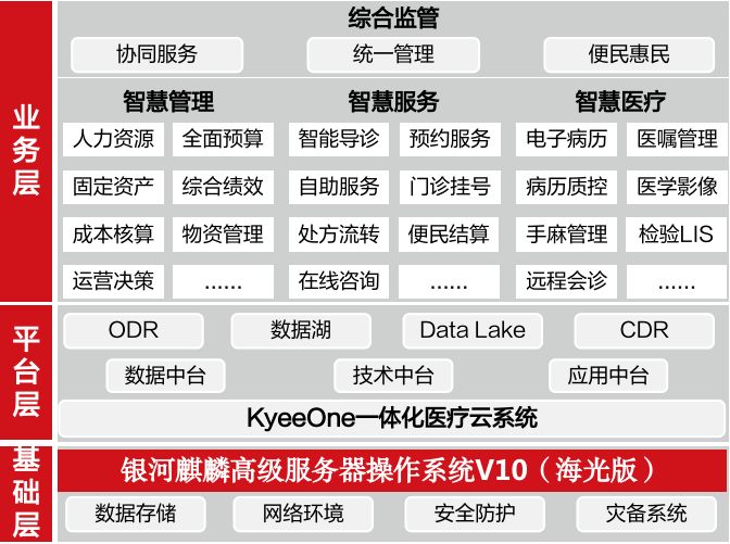 基于銀河麒麟操作系統的智慧醫療云聯合解決方案,以搭建全棧國產化環境為基礎,利用云計算等先進技術,為醫院搭建智慧醫療、智慧管理,智慧服務等綜合應用為一體的醫療云平臺。整合院內各科室業務,快速實現全院信息系統互聯互通,降低信息化建設和運維成本,全面提升醫院醫療質量與服務水平。KyeeOne全院信息化解決方案涵蓋一體化醫療云、智慧病房等諸多業務內容,為醫療機構打造“三位一體”(智慧醫療、智慧服務、智慧管理)的智慧醫院,幫助醫療機構提升服務質量和效率,保障醫療安全,其一體化云架構有效降低系統建設成本和運維成本,同時也能滿足智慧區域、緊密型醫共體的建設需求,從而有效促進醫院信息產業向國產化、智能化、精細化方向發展。