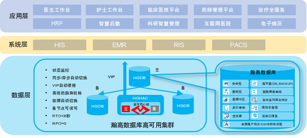 建設內容:瀚高數據庫與銀河麒麟操作系統針對不同自主CPU平臺在內核安全、IO性能及驅動支持等方面優化增強,為核心HIS、EMR、RIS、PACS等臨床信息系統,以及面向患者的互聯網智慧醫療服務平臺提供先進的數據庫高可用集群支撐。